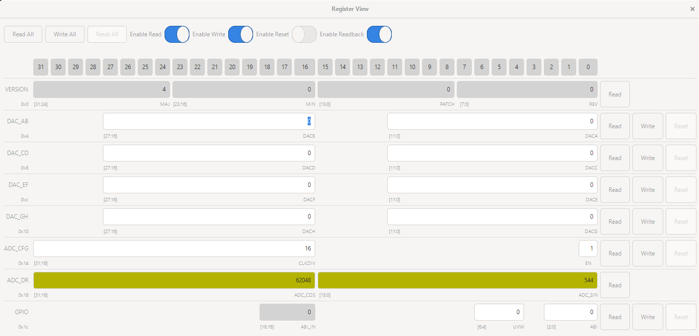 If a field has changed its value since the last read, it will be marked yellow. When you enter an invalid number into a field (e.g. 12 in a 3-bit register), the entry box will turn red, and you will not be able to write the register.